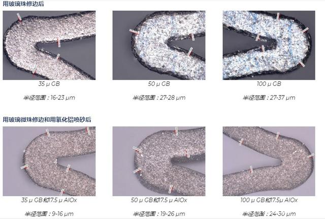 經過吉川公司工藝工程師測試,用氧化鋁砂進行定向的噴砂處理可以去除氧化層,平滑表面缺陷并改善外圍支架的表面質量。支架的受損區域很脆,但基礎材料鎳鈦諾卻具有延展性。氧化鋁噴砂磨料使用去氧化層,并且對韌性基體的侵蝕最小,從而在支架撐桿的整個長度上形成均勻的表面光潔度。 市場最新的支架設計和醫療植入物要求更大的邊緣倒圓角。圓形邊緣降低了被植入物卡住,其他風險的可能性。氧化鋁微噴丸的半徑為5-15 m,但新的幾何尺寸指定為接近25 m。該半徑可以通過三種途徑實現:延長噴砂周期,使用更大尺寸的氧化鋁或完全使用其他磨料。通過測試,我們了解到更長的噴砂周期可以去除更多的團塊,而較大尺寸的氧化鋁會產生過于粗糙而無法拋光的表面。畢竟,氧化鋁顆粒的形狀為塊狀,邊緣稍尖。這給了我們一個可行的選擇:嘗試使用其他類型的磨料。為了克服這一障礙,我們測試了幾種類型的介質,發現用玻璃珠噴砂可以在拐角處形成所需的半徑(最大30 m),而不會除去設備的額外質量。結果是氧化鋁的質量提高了十倍。經過吉川公司工藝工程師的測試事實說明了結果的差異。用氧化鋁噴砂處理過的樣品的半徑僅為8-13 m,而用玻璃珠噴砂處理過的樣品的半徑為24-30 m。 經過吉川公司工藝工程師最終測試事實證明,最好的心臟支架噴砂工藝需要用氧化鋁砂粗噴砂、再用玻璃珠微噴砂是目前最好的一種噴砂工藝方式。 經過粗噴、微噴的產品外徑和內徑轉角處的半徑可以實現,而所需的附加材料去除最少。半徑的大小可以有效地控制,因為它是基于圓形磨料,玻璃珠的大小和速度的??梢钥刂凭哂懈郊影霃降闹Ъ軈^域。通過機械加工表面,有助于保持支架的疲勞壽命。玻璃珠磨料通常用于必須保持嚴格公差的噴丸處理應用中。玻璃珠對支架表面進行噴丸處理,不會去除任何材料或數量可忽略不計的材料。如下所示,玻璃珠的尺寸很重要。玻璃珠的尺寸越大;邊緣越圓。玻璃珠有35 ,50 和100 兩種。讓我們看一下使用每種尺寸的樣本測試的結果。此處顯示的未噴砂的支架表面(500x)邊緣鋒利,并受到制造損壞。半徑范圍僅為3-8 m。為什么用兩種磨料處理比單獨用氧化鋁處理好? 玻璃珠無法消除制造過程中產生的浮渣,回彈和其他損壞;只有氧化鋁可以。氧化鋁不能產生真正的圓形邊緣。但是,它確實可以提供電拋光所需的理想表面光潔度。一個不能替代另一個。通過使用多步驟過程,植入物表面可以使用經過驗證的相同設備獲得兩全其美的效果。在該過程中添加第二種研磨劑聽起來可能需要更多的勞動力,但實際上比其他修邊過程更有效。例如,電拋光可以產生較大的半徑,但它也會從整個零件中去除過多的材料,而不僅僅是角部,從而損害了支架的疲勞壽命。