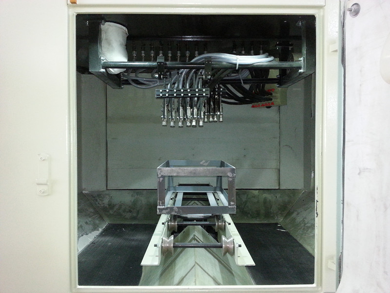 該設備是根據不銹鋼水槽產品特性而專門設計的(非標準型)轉動式自動噴砂機,完全適合購方所提供的產品。根據購方對產品效率的要求,設備采用轉動推車式噴砂機。